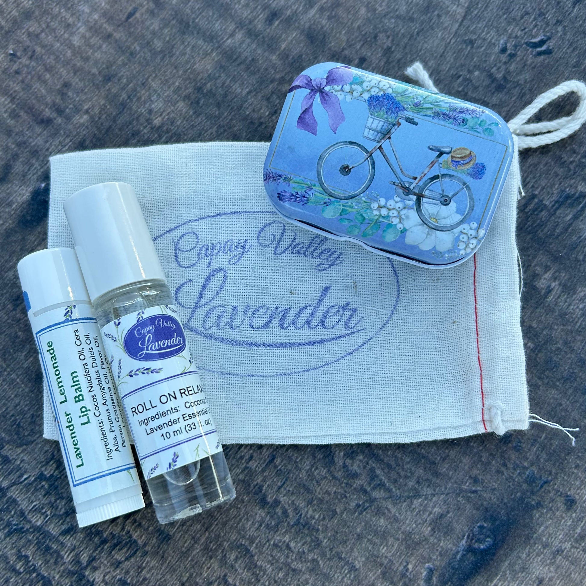 Our Bee Calm Balm, Roll on Relaxer, and Lavender Lemonade Lip Balm packaged in our muslin bag. Great little bag for a purse or backback!