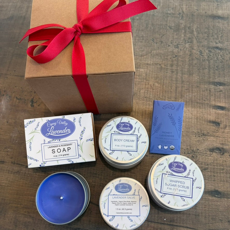 Includes lavender body cream, sugar scrub, soap, salve, candle, and a bar of artisan lavender chocolate.